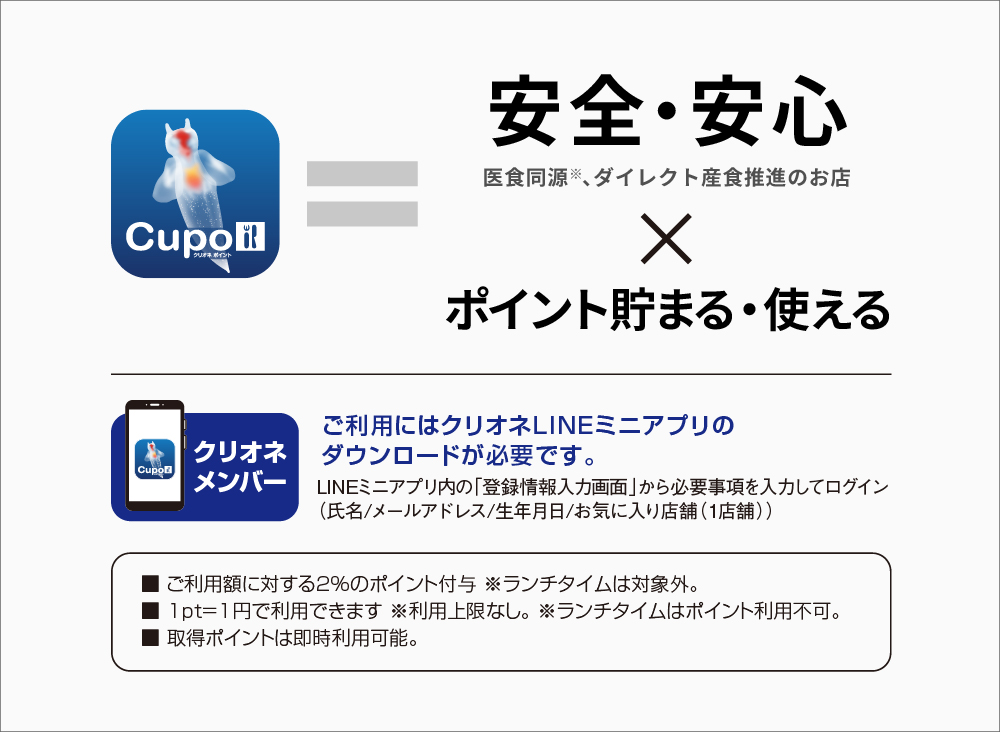 「豊かな大自然」と「食の安全安心」のシンボルです。安全で美味しいものを食べてポイントが溜まる。「クリオネポイント=Cupo(クポ)」には、そんな想いが込められています。